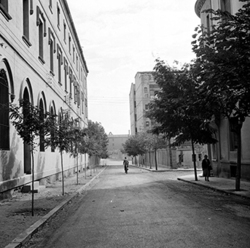"Carrer Bisbe Messeguer, arribant al xamfrà amb el Carrer Alcalde Sol, en sentit ascendent; a l’esquerra, l’edifici del Seminari i a la dreta, la Clínica Perpetuo Socorro"