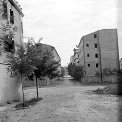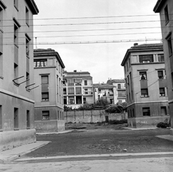 "Carrer Ramon y Cajal; blocs d’habitatges socials, entre els que hi ha el Passatge del Capità Farré i el Carrer Mestre Emili Pujol, al fons"
