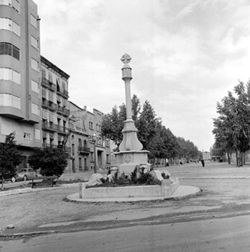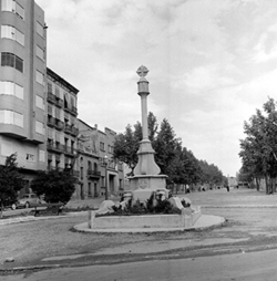 "Part baixa de la Rambla d’Aragó, a tocar l’Avinguda de Catalunya; en primer terme es veu la Creu dels Tres Tombs"