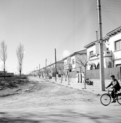 "Grup d’habitatges unifamiliars que en l’època es conegué amb el nom de Grupo 3 de abril ; futur Passeig de Ronda, des de l’Avinguda Alcalde Rovira Roure, antiga carretera nacional 240; en primer terme, un home amb bicicleta"