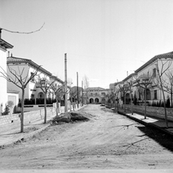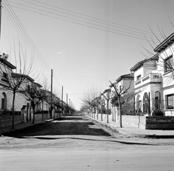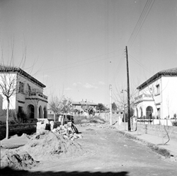 "Grup d’habitatges unifamiliars que en l’època es conegué amb el nom de Grupo 3 de abril ; possiblement és tracta del Carrer del Canigó, vist des de l’Avinguda de Navarra."