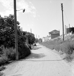 "Barri de Pardinyes; a la dreta, vista de l’antiga pujada del Camí de Corbins al pont sobre les vies del ferrocarril, a l’antiga estació de classificació ferroviària; en primer terme el Carrer Ramon Argilés"