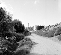"Barri de Pardinyes; a la dreta, vista de l’antiga pujada del Camí de Corbins al pont sobre les vies del ferrocarril, a l’antiga estació de classificació ferroviària; en primer terme el Carrer Ramon Argilés; al fons el veu el dipòsit de l’antiga fàbrica de gas"