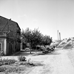 "Barri de Pardinyes; a la dreta, vista de l’antiga pujada del Camí de Corbins al pont sobre les vies del ferrocarril, a l’antiga estació de classificació ferroviària; en primer terme el Carrer Ramon Argilés"