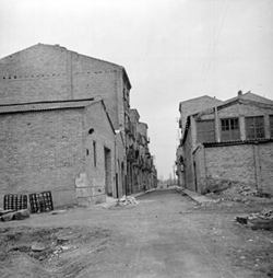 "Barri de Pardinyes; possiblement carrer al final del Carrer Ramon Argilés, cap a la Mitjana; a l’esquerra, les instal·lacions ferroviàries de El Recorrido"