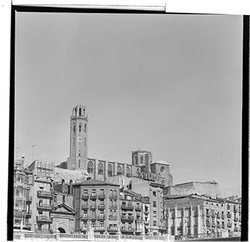"Vista des del marge esquerre del Riu Segre; en primer terme, la Porta del Pont i la Plaça Agelet i Garriga i l'Avinguda de Francesc Macià; al fons, el conjunt de la Seu Vella"