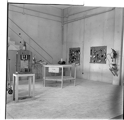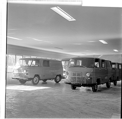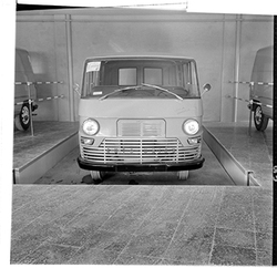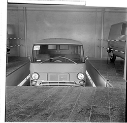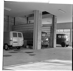 "Eduardo Velasco; concessionari oficial de vehicles Mercedes; furgonetes d’aquesta marca, i de la marca DKW, a l’interior dels tallers, al Carrer de Santa Cecília; barri de Cappont; demostració dels elevadors hidràulics"