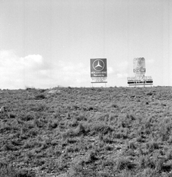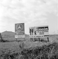 "Cartell pulicitari de la marca Eduardo Velasco, de vehicles Mercedes, annex a la carretera nacional II, terme de Lleida, partida del Tossal de Moradilla, el qual apareix al fons; apareix publicitat dels magatzems de roba Simeon"