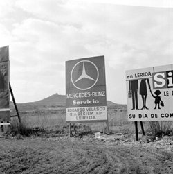 "Cartell pulicitari de la marca Eduardo Velasco, de vehicles Mercedes, annex a la carretera nacional II, terme de Lleida, partida del Tossal de Moradilla"