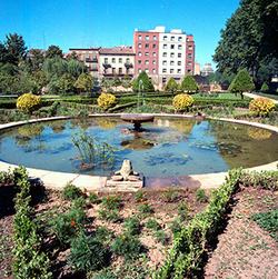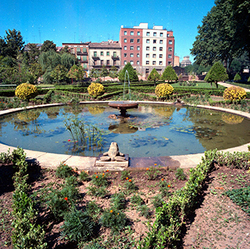 "Camps Elisis; barri de Cappont; vista dels jardins, la font decorativa i estany, en primer terme; al fons, els edificis de l'Avinguda de les Garrigues"