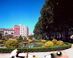 "Camps Elisis; barri de Cappont; vista dels jardins, la font decorativa i estany, en primer terme; al fons, els edificis de l'Avinguda de les Garrigues"