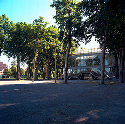 "Camps Elisis; barri de Cappont; final del passeig central, en primer terme; a l’esquerra, el Palau de Vidre; al fons, es veu parcialment l'Avinguda Josep Tarradellas, antiga Carretera Nacional II"