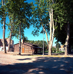 "Camps Elisis; barri de Cappont; part final del passeig central; a l’esquerra, es veu la caseta de fusta construïda per la Jefatura Provincial de Montes com a estand Fira de Sant Miquel, i posteriorment, estand de la fàbrica de cervesa San Miguel Fábrica de Cerveza y Malta "