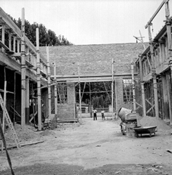 "Eduardo Velasco; construcció dels nous tallers, als carrers de Santa Cecília, Eduardo Velasco i Avinguda d'Alacant; aixecament de murs; vista interior; al fons, els Camps Elisis"