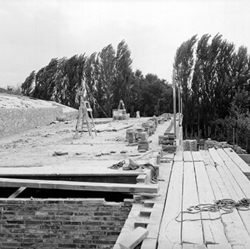 "Eduardo Velasco; construcció dels nous tallers, als carrers de Santa Cecília, Eduardo Velasco i Avinguda d'Alacant; aixecament de murs i teulades; al fons, els Camps Elisis"