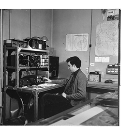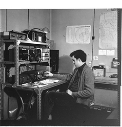 "Lluís Terrés Pàmpols i Saltó al davant de l’equipament de ràdio afeccionat; fotografia al domicili particular del Sr. Terrés"