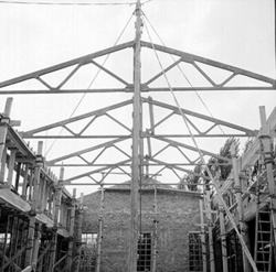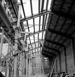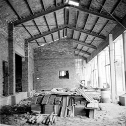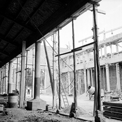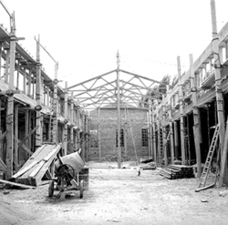 "Eduardo Velasco; construcció dels nous tallers, als carrers de Santa Cecília, Eduardo Velasco i Avinguda d'Alacant; aixecament de murs i cobriment; vista interior"