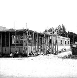 "Eduardo Velasco; construcció dels nous tallers, als carrers de Santa Cecília, Eduardo Velasco i Avinguda d'Alacant; aixecament de murs; vista exterior, des del xamfrà entre els carrers esmentats"