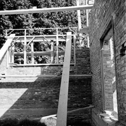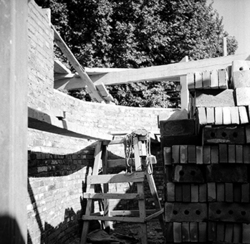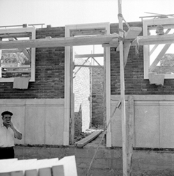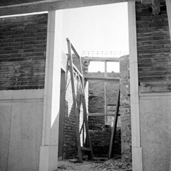 "Eduardo Velasco; construcció dels nous tallers, als carrers de Santa Cecília, Eduardo Velasco i Avinguda d'Alacant; aixecament de murs; porta d’accés a les oficines des del Carrer Eduardo Velasco, amb un obrer"