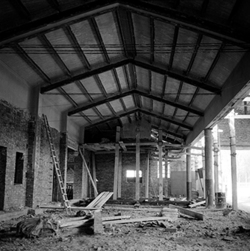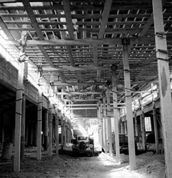 "Eduardo Velasco; construcció dels nous tallers, als carrers de Santa Cecília, Eduardo Velasco i Avinguda d'Alacant; aixecament de murs i teulades; vista interior"