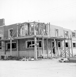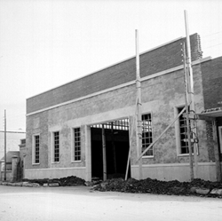 "Eduardo Velasco; construcció dels nous tallers, als carrers de Santa Cecília, Eduardo Velasco i Avinguda d'Alacant; aixecament de murs; vista exterior, des del xamfrà entre els carrers esmentats"