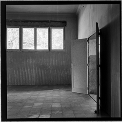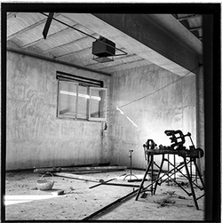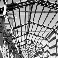 "Eduardo Velasco; construcció dels nous tallers, als carrers de Santa Cecília, Eduardo Velasco i Avinguda d'Alacant; aixecament de murs i teulada; vista interior"