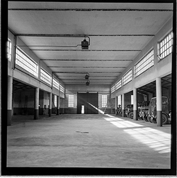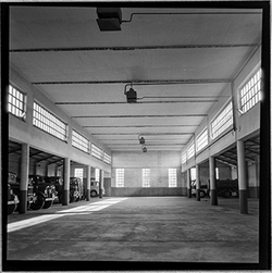 "Eduardo Velasco; construcció dels nous tallers, als carrers de Santa Cecília, Eduardo Velasco i Avinguda d'Alacant; tallers; vista interior amb vehicles aparcats"