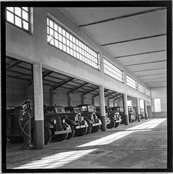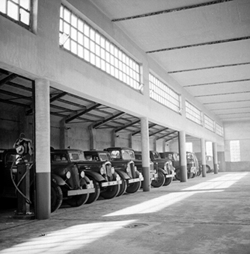 "Eduardo Velasco; construcció dels nous tallers, als carrers de Santa Cecília, Eduardo Velasco i Avinguda d'Alacant; tallers; vista interior amb vehicles aparcats"