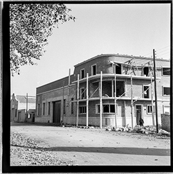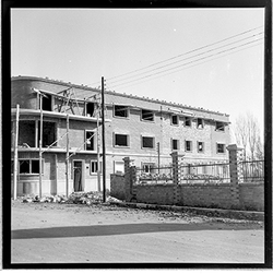"Eduardo Velasco; construcció dels nous tallers, als carrers de Santa Cecília, Eduardo Velasco i Avinguda d'Alacant; aixecament de murs; vista exterior, des del xamfrà entre els carrers esmentats"