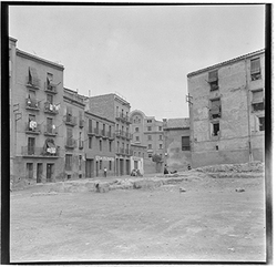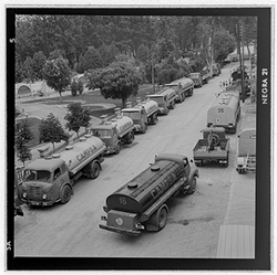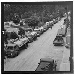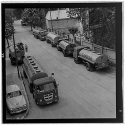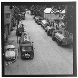 "Vista del carrer de Santa Cecília des del domicili particular del Sr. Terrés. A la dreta hi ha els arbres dels Camps Elisis, al costat, es veuen diversos camions de distribució de petrolis de CAMPSA."