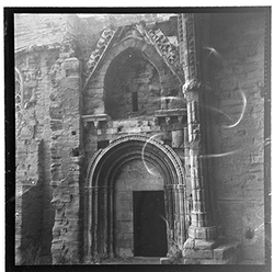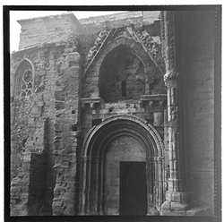 "Imatge de la porta romànica de la capella de Jesús de la Seu Vella, captada des de les escales de la Porta dels Fillols. A la fotografia s’observa la portalada amb els seus arcs i detalls escultòrics característics de l’estil romànic."