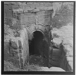 " Imatge de la baixada que condueix a la porta de la cripta de la capella de Requesens, a la Seu Vella. S’observa l’accés a la cripta, envoltat per elements arquitectònics de pedra."