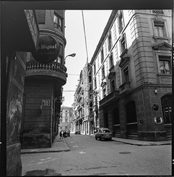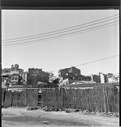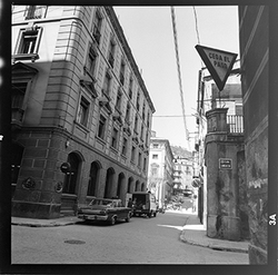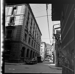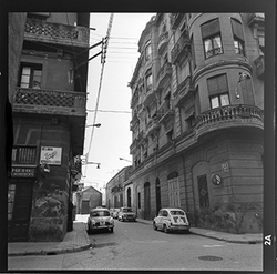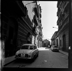 "Vista de la part final del Carrer Alcalde Fuster; al fons hi hauria l'Avinguda del Segre, la sortida a la qual està barrada per diversos edificis; en primer terme apareix aparcat un cotxe de la marca Renault Dauphine - Gordini"