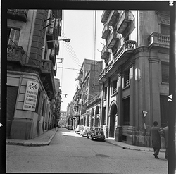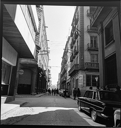 "Vista del Carrer Comerç, des del xamfrà amb el Carrer Alcalde Fuster; al fons hi ha l'edifici del Gobierno Civil (Govern Civil)"
