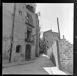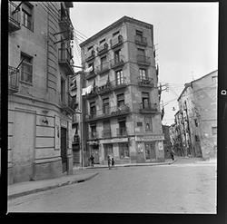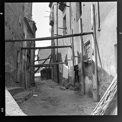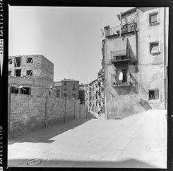 "Vista d’un carrer de la zona alta del Canyeret, amb uns edificis apuntalats amb bigues de ferro; possiblement sigui el Carrer de la Parra"