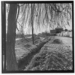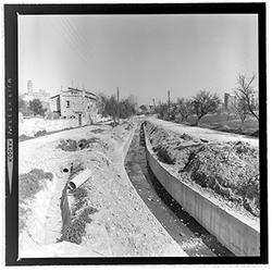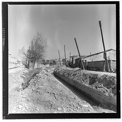 "Vista de les obres de canalització i cobriment de la Sèquia de Torres en el seu recorregut pel barri de Cappont, en el tram corresponent a l’actual Avinguda de València. Segurament, la zona es troba al voltant de l’actual Avinguda Jaume II i la Plaça Blas Infante, antic Camí Vell d’Albatàrrec."