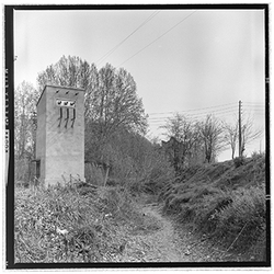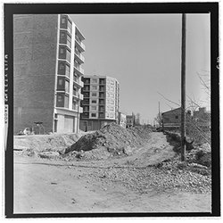 "Vista de les obres de canalització i cobriment de la Sèquia de Torres, en un sector que podria correspondre als voltants dels Camps Elisis. A l’esquerra de la imatge s’observa la caseta d’un transformador elèctric."