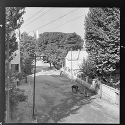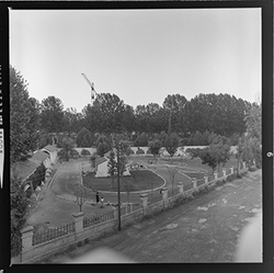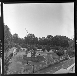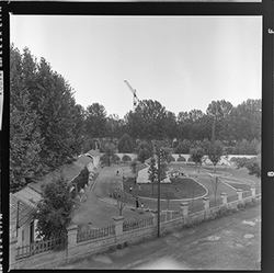"Vista del Parc Infantil Ana Mari, situat als Camps Elisis, que inclou un circuit per a karts i pràctiques d’educació vial. La imatge està presa des del domicili particular de Lluís Terrés Pàmpols, al Carrer de Santa Cecília, amb aquest en primer terme."