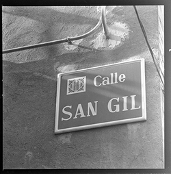 "Detall d’una placa amb el nom del carrer: Calle de San Gil , o Carrer Sant Gil"