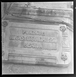 Detall d’una placa amb el nom del carrer: Plaza de Augusto González Besava