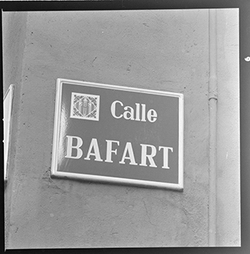 "Detall d’una placa amb el nom del carrer: Calle Bafart , o Carrer dels Bafart"