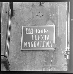 "Detall d’una placa amb el nom del carrer: Calle Cuesta Magdalena, o Costa de la Magdalena"