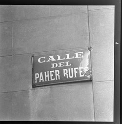 Detall d’una placa amb el nom del carrer: Calle del Paher Rufes