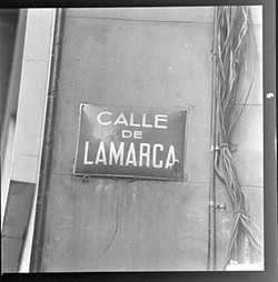 "Detall d’una placa amb el nom del carrer: Calle de Lamarca , o Carrer Lamarca"