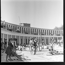 "Parque municipal Alcalde Pons , Les Basses; piscines amb banyistes i vestidors al fons"
