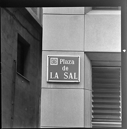 "Detall d’una placa amb el nom del carrer: Plaza de La Sal, o Plaça de la Sal"