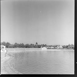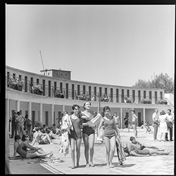 "Parque municipal Alcalde Pons , Les Basses; piscines amb banyistes i vestidors al fons"
