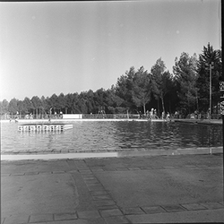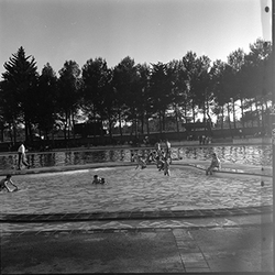 "Parque municipal Alcalde Pons , Les Basses; piscines amb banyistes; al fons es veu el bosc"