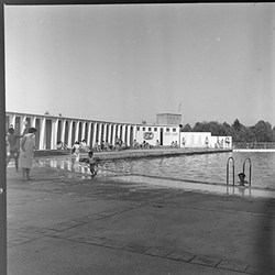 "Parque municipal Alcalde Pons , Les Basses; piscines amb banyistes, amb el bosc al fons"