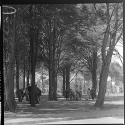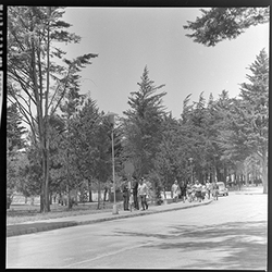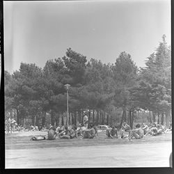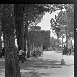 "Parque municipal Alcalde Pons , Les Basses; bosc amb diverses persones descansant; al fons l’entrada principal"